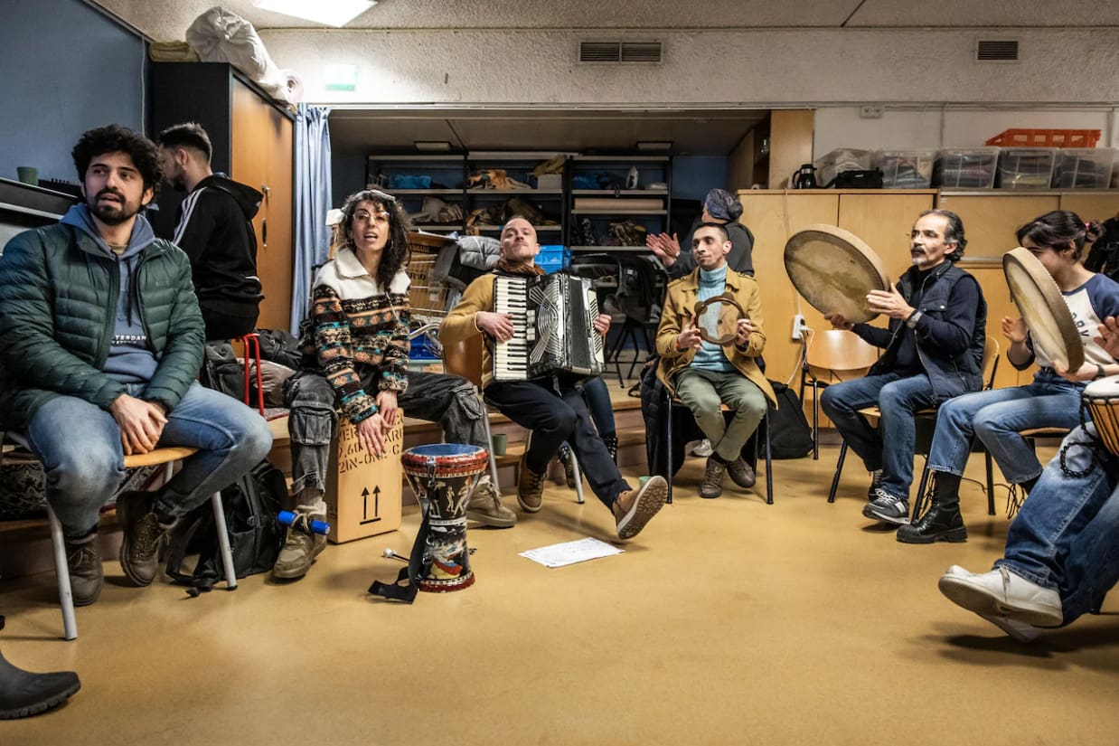 Muzikanten repeteren bij Boost voor de voorstelling ‘Oost trekt de wereld in’ van het programma ‘Leven in je buurt!’. Links de Iraanse Milad Ahmadi, daarnaast de Turkse begeleidster Ezgi Elkirmis. Rechts een Koerdische vader en dochter met het percussie-instrument de daf.
